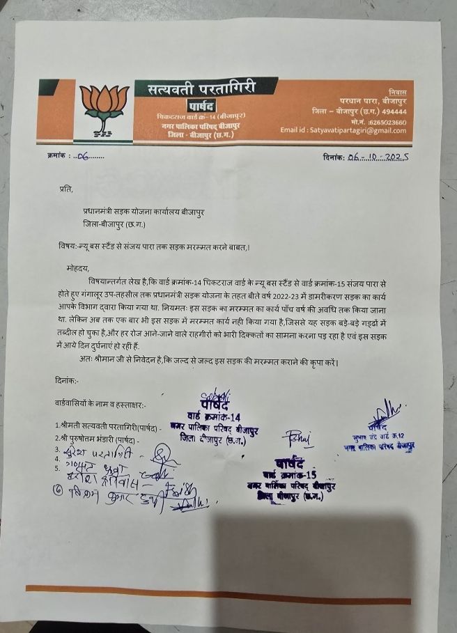 सोमवार को नगर पालिका बीजापुर के पार्षदगण एवं ग्रामीणों ने प्रधानमंत्री ग्राम सड़क योजना के अधिकारी नवीन कुमार टोंडे से मुलाकात कर सड़क मरम्मत की माँग रखी। प्रतिनिधिमंडल ने न्यू बस स्टैंड से गंगालूर पुलिस लाइन तक सड़क की तत्काल मरम्मत करने संबंधी ज्ञापन भी सौंपा।