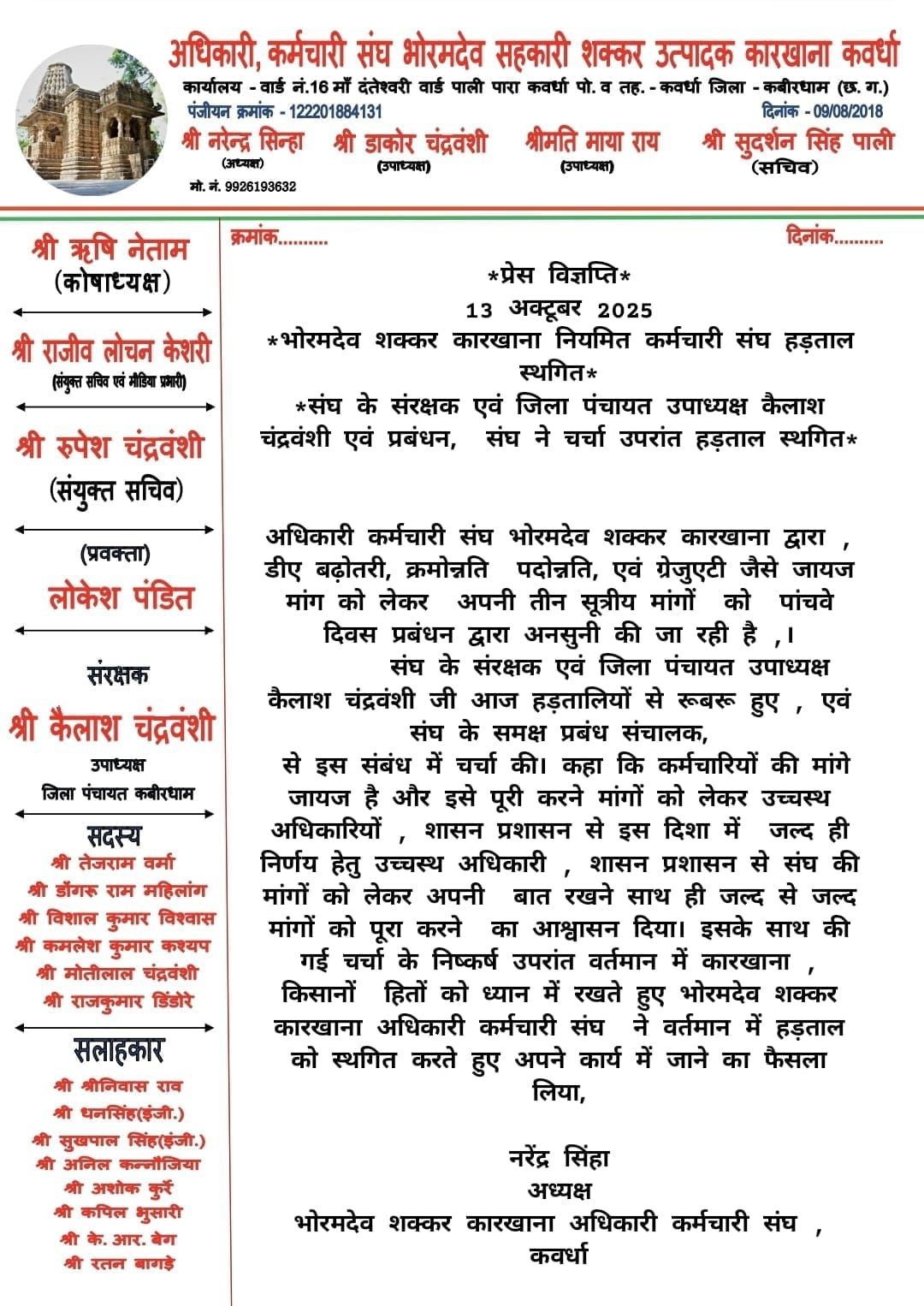 भोरमदेव शक्कर कारखाना अधिकारी कर्मचारी संघ , कवर्धाकी ओर से जारी की गई।