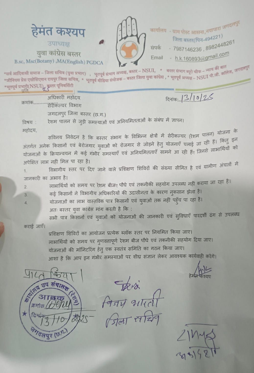रेशम पालन में अनियमितताओं को लेकर बस्तर युवा कांग्रेस जिला उपाध्यक्ष हेमंत कश्यप ने सौंपा ज्ञापन