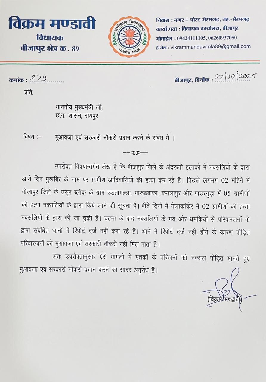 नक्सलियों द्वारा ग्रामीणों की हत्या किए जाने को लेकर विधायक विक्रम मंडावी ने मुख्यमंत्री विष्णुदेव साय को लिखा पत्र