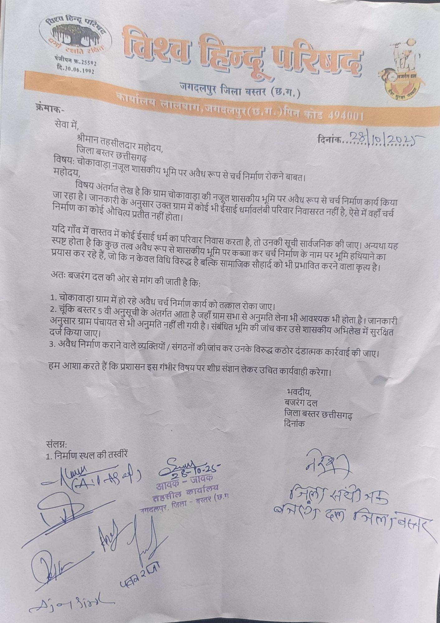जगदलपुर।बस्तर जिले के ग्राम चोकावाड़ा में नजूल शासकीय भूमि पर अवैध रूप से चर्च निर्माण किए जाने और पेड़ों की अवैध कटाई किए जाने का मामला सामने आया है। इस संबंध में बजरंग दल, जिला बस्तर इकाई ने तहसीलदार को ज्ञापन सौंपकर अवैध गतिविधियों पर तत्काल रोक लगाने की मांग की है।