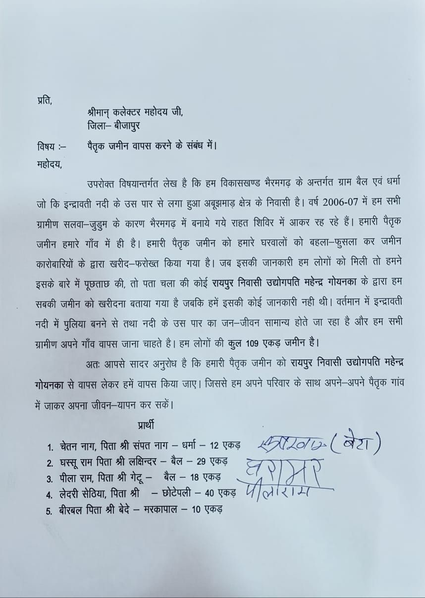 विधायक विक्रम मंडावी ने कहा कि इंद्रावती नदी पर पुल बनने से अबूझमाड़ क्षेत्र से लगे इन गांवों का जन-जीवन धीरे-धीरे सामान्य हो रहा है। ये ग्रामीण अपने मूल गांवों में लौटना चाहते हैं। लेकिन जब वे लौटने की तैयारी कर रहे थे, तभी उन्हें पता चला कि उनकी जमीनें किसी और की हो चुकी हैं।