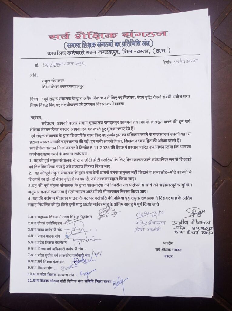 ज्ञापन में पूर्व जे डी द्वारा छोटी-छोटी गलतियों के लिए बिना कारण जाने किए गए शिक्षकों के निलंबन को तत्काल निरस्त करने, पूर्व जे डी द्वारा मात्र डेली डायरी उनके अनुरूप नहीं लिखने व अन्य छोटे-मोटे कारणों से रोकी गई शिक्षकों की दो-दो वेतन वृद्धि को तत्काल बहाल करने, पूर्व जे डी द्वारा शासन आदेश के विपरीत सुविधानुसार किए गए संलग्नीकरणों को निरस्त करने और प्रधान पाठक पद पर त्रुटिरहित पदोन्नति दिसंबर माह के पूर्व करने की मांग शामिल हैं। नव पदस्थ संयुक्त संचालक ने सभी शिक्षक संगठनों को आश्वस्त किया कि किसी भी शिक्षक को डरने या भयभीत होने की जरूरत नहीं है और समस्त मांगों को शीघ्र पूर्ण किया जाएगा। संयुक्त संचालक से सौजन्य भेंट के दौरान प्रमुख रूप से गजेंद्र श्रीवास्तव, प्रवीण श्रीवास्तव, देवराज खुंटे, आरडी तिवारी, अजय श्रीवास्तव, रामऊ लाल सार्वा, चंद्रप्रकाश देवांगन, भूपेश पाणिग्रही, पीजी राव, डॉ लूदरसन कश्यप, तुलादास मानिकपुरी, जीएल यादव, संजय वैष्णव, विक्रम परिहार, मनीष ठाकुर, शिव चंदेल, गणेश्वर नायक, मोहम्मद ताहिर शेख, उमेश सिंह, आरपी मिश्रा और अन्य पदाधिकारी उपस्थित थे।