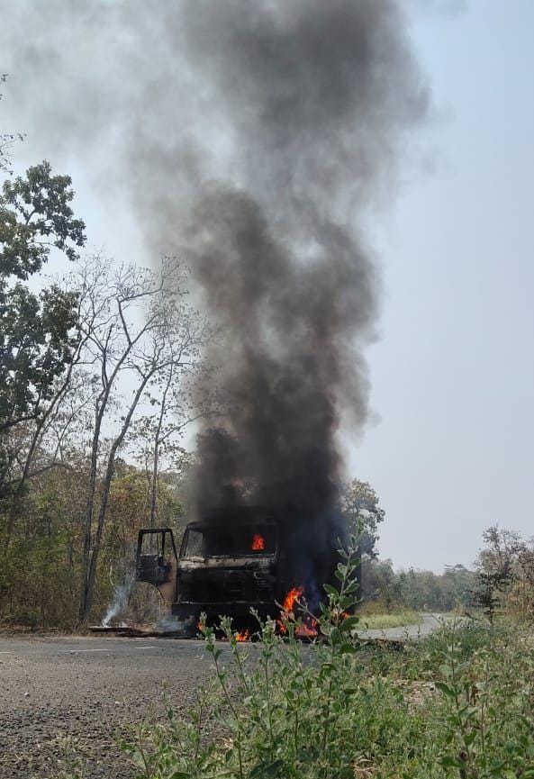 BREKING -सड़क निर्माण कार्य मे लगे हाइवा वाहन को माओवादियों ने किया आग के हवाले