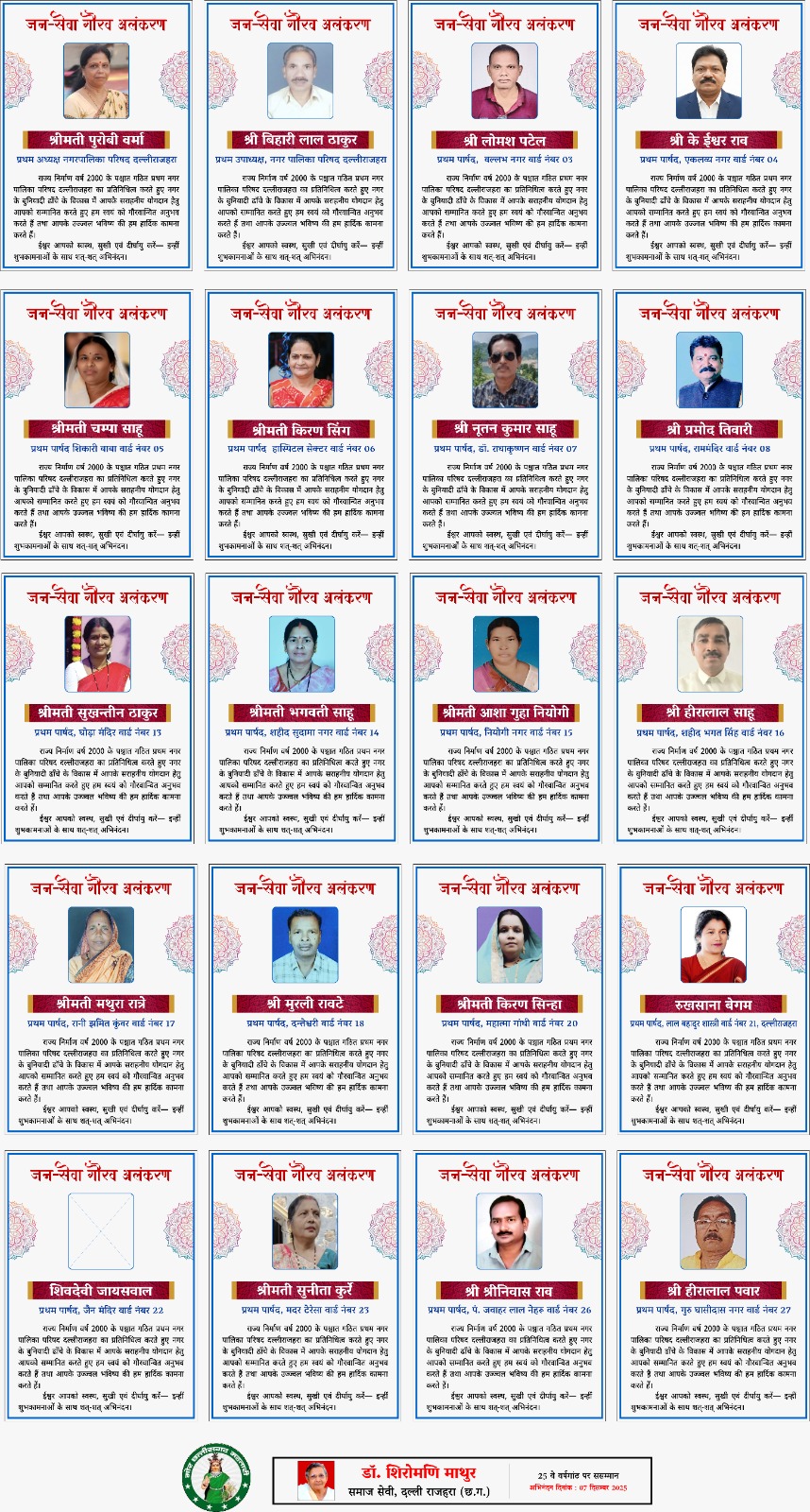 दल्ली राजहरा। नगर पालिका दल्ली राजहरा की स्थापना के 25वर्ष पूर्ण होने और छत्तीसगढ़ प्रदेश बनने पर प्रथम नगर पालिका अध्यक्ष पुरोबी वर्मा और उनके साथी पार्षदों का सम्मान आज 7 नवंबर को नगर की प्रसिद्ध साहित्यकार एवं समाजसेविका डॉ. श्रीमती शिरोमणि माथुर द्वारा किया जाएगा। विदित हो कि डॉ. श्रीमती शिरोमणि माथुर समय समय पर शहर और जिले के विशिष्ट लोगों का सम्मान करती आ रही हैं।