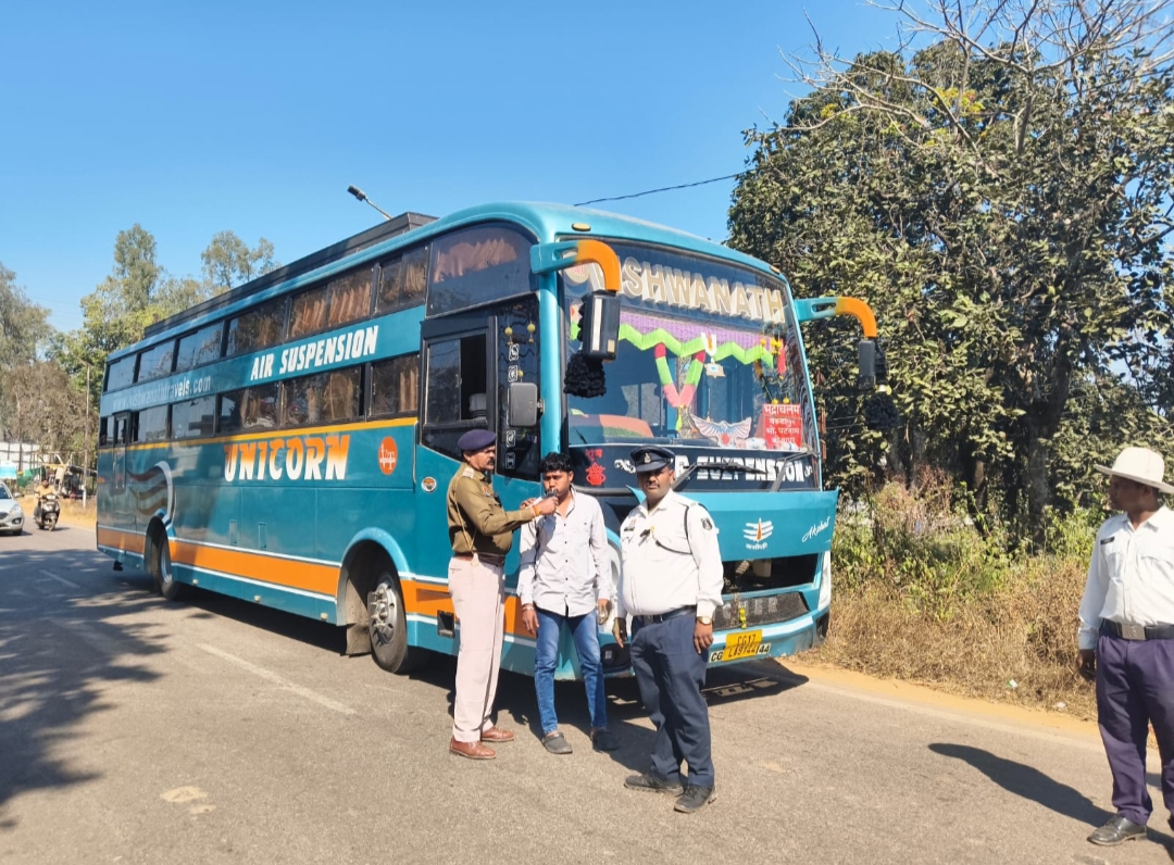 बीजापुर:- वरिष्ठ पुलिस अधिकारियों के दिशा निर्देश पर यातायात पुलिस बीजापुर द्वारा बस चालको पर चालानी कार्यवाही किया गया । दिनांक 11.12. 2025 को सवारी बसों एवं अन्य वाहनों के द्वारा लगातार नियमों को दरकिनार करते हुए लापरवाही वाहन चलाना एवं यातायात नियमों का पालन नहीं करने वाले ऐसे 23 वाहनों के खिलाफ मोटर व्हीकल एक्ट के विभिन्न धाराओं के तहत चलानी कार्रवाई कर 14,100 समन शुल्क वसूल किया गया।