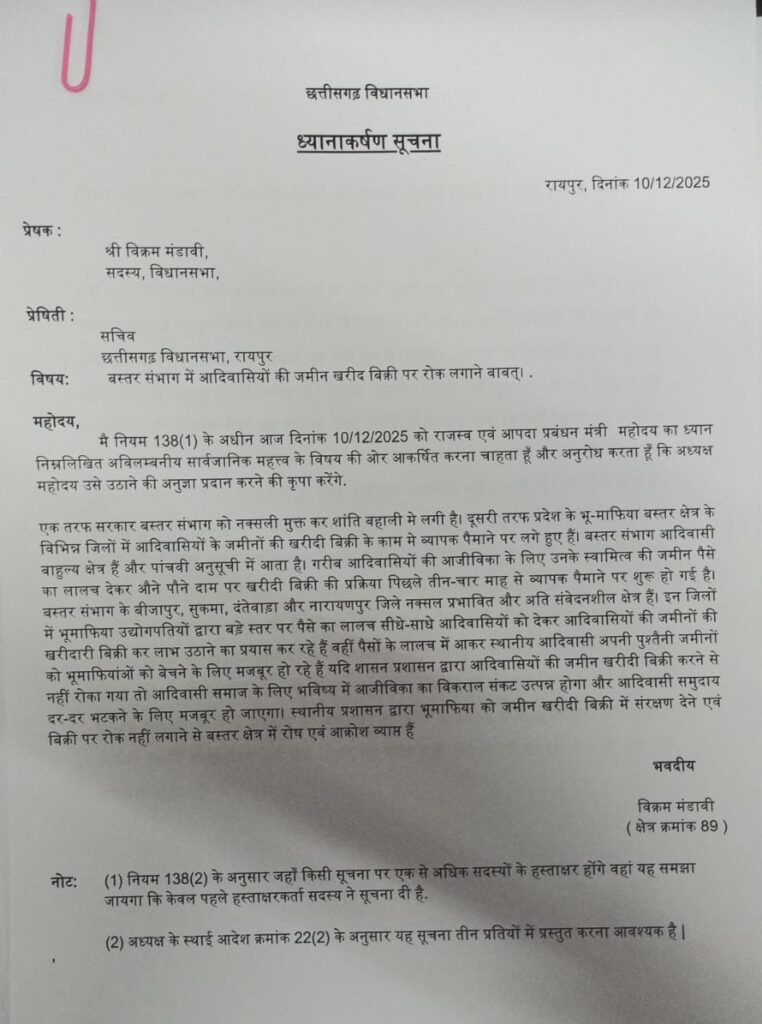 बस्तर संभाग में आदिवासियों की जमीन की खरीद-बिक्री पर रोक लगाने विधायक विक्रम मंडावी ने विधानसभा में दिया ध्यानाकर्षण प्रस्ताव