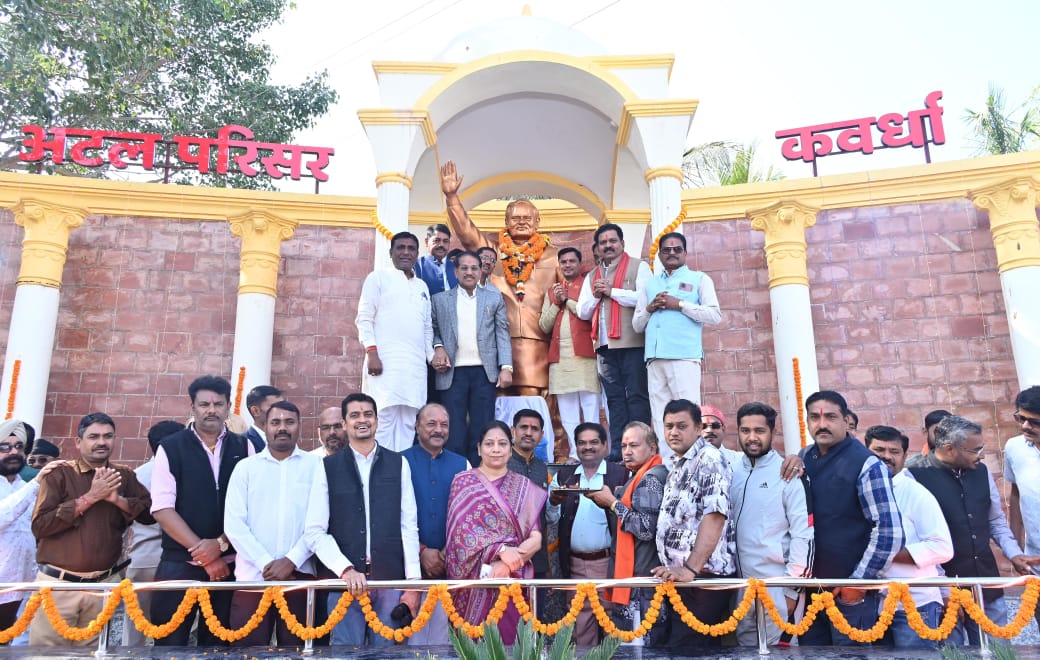 कवर्धा :- उपमुख्यमंत्री विजय शर्मा ने पूर्व प्रधानमंत्री भारत रत्न स्वर्गीय श्री अटल बिहारी वाजपेयी की जयंती के अवसर पर अटल परिसर स्थित उनकी प्रतिमा पर माल्यार्पण कर श्रद्धासुमन अर्पित किए। इस अवसर पर उपमुख्यमंत्री विजय शर्मा ने कहा कि श्रद्धेय स्वर्गीय श्री अटल बिहारी वाजपेयी छत्तीसगढ़ राज्य के निर्माता थे। उनका छत्तीसगढ़ से विशेष लगाव रहा है। उन्होंने छत्तीसगढ़ के भौगोलिक क्षेत्र को एक नए राज्य का स्वरूप देकर प्रदेशवासियों की भावनाओं का सम्मान किया, जिसके लिए वे सदैव स्मरणीय रहेंगे। उपमुख्यमंत्री ने कहा कि अटल जी बहुमुखी प्रतिभा के धनी थे। वे एक महान राजनेता, कुशल प्रशासक, संवेदनशील कवि और दूरदर्शी नेता थे, जिनका योगदान देश और प्रदेश के विकास में अविस्मरणीय रहेगा। इस अवसर पर उपस्थित जनप्रतिनिधियों ने भी स्वर्गीय अटल बिहारी वाजपेयी के प्रतिमा पर पुष्पांजलि अर्पित कर उन्हें नमन किया। इस अवसर पर पूर्व संसदीय सचिव डॉ. सियाराम साहू एवं मोतीराम चंद्रवंशी, राजेंद्र चन्द्रवंशी, जिला पंचायत अध्यक्ष ईश्वरी साहू, उपाध्यक्ष कैलाश चंद्रवंशी, पूर्व जिला पंचायत अध्यक्ष एवं सभापति रामकुमार भट्ट, नगर पालिका अध्यक्ष चन्द्रप्रकाश चंद्रवंशी, उपाध्यक्ष पवन जायसवाल, पूर्व जिला पंचायत अध्यक्ष संतोष पटेल, पीयूष ठाकुर, सुरेश दुबे, विजय पटेल, मनीराम साहू, जसविंदर बग्गा, सनत साहू, सुनील दोषी, पन्ना चंद्रवंशी, श्रीमती सतविंदर पाहुजा, सानु साहू, राजा द्विवेदी, संजीव कुर्रे, अजय ठाकुर, बिहारी धुर्वे, दुर्गेश अवस्थी, केशरीचंद सोनी सहित जनप्रतिनिधि उपस्थित थे।