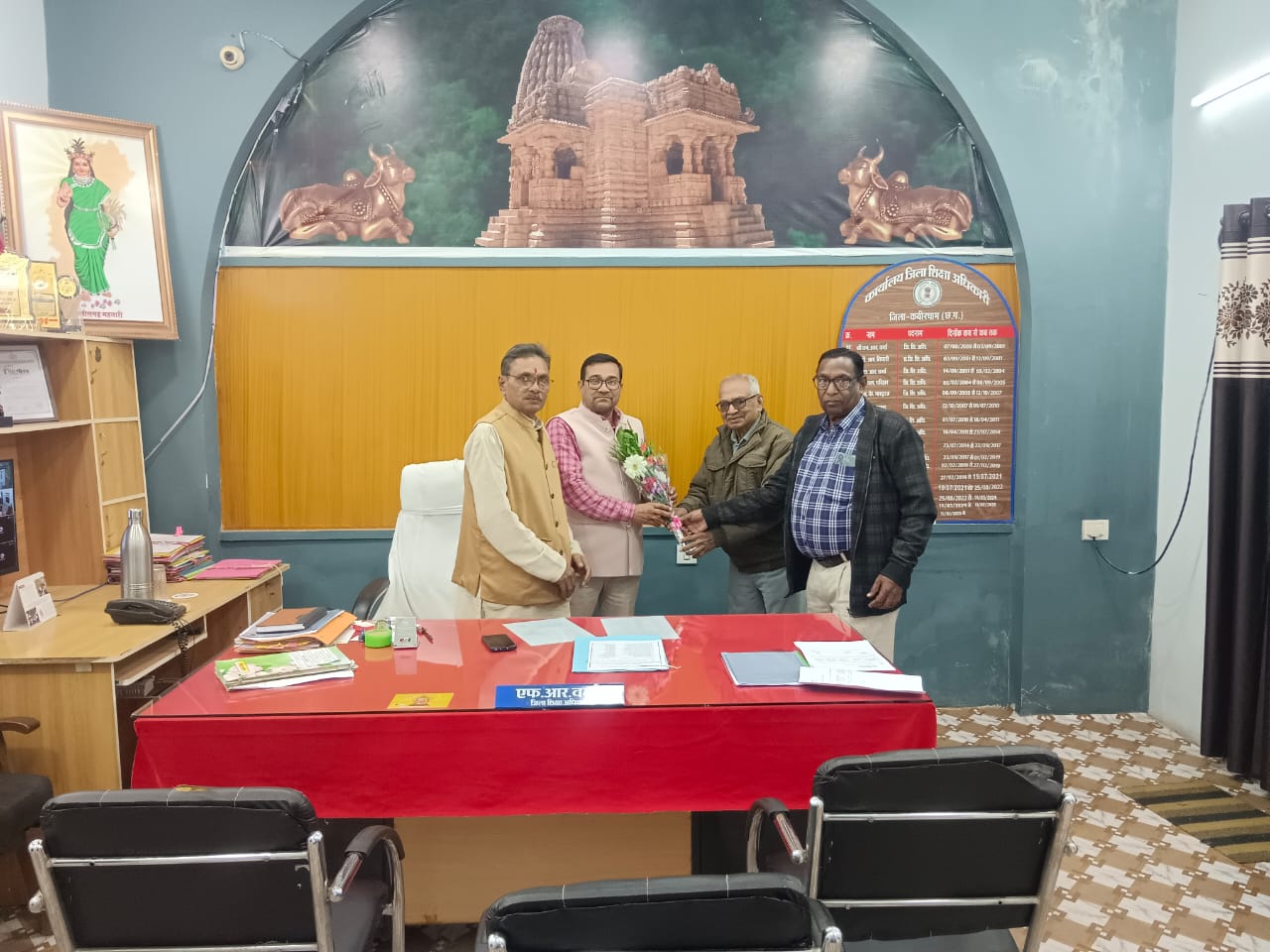 उक्त संबंध में दिनांक 6 जनवरी कबीरधाम जिला पेंशनर्स संघ के अध्यक्ष प्रताप चंद्रवंशी कवर्धा तहसील पेंशनर संघ के अध्यक्ष प्रकाश कुमार गुप्ता एवं सलाहकार इंजीनियर एस एस जैन ने जिला शिक्षा अधिकारी से सौजन्य भेट की एवं शिक्षकों के मानदेय एवं अन्य लंबित भुगतान शीघ्र भुगतान हेतु आवेदन दिया।