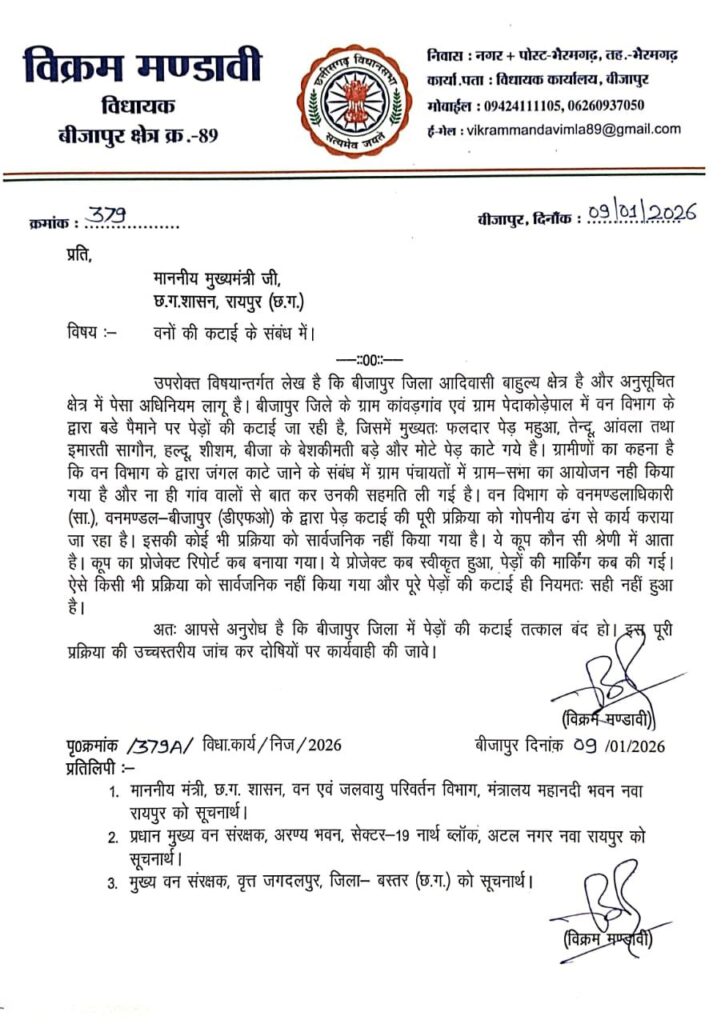बिना ग्राम सभा की मंजूरी के पेड़ों की अवैध कटाई: विधायक विक्रम मंडावी ने CM को लिखा पत्र, तत्काल रोक की मांग