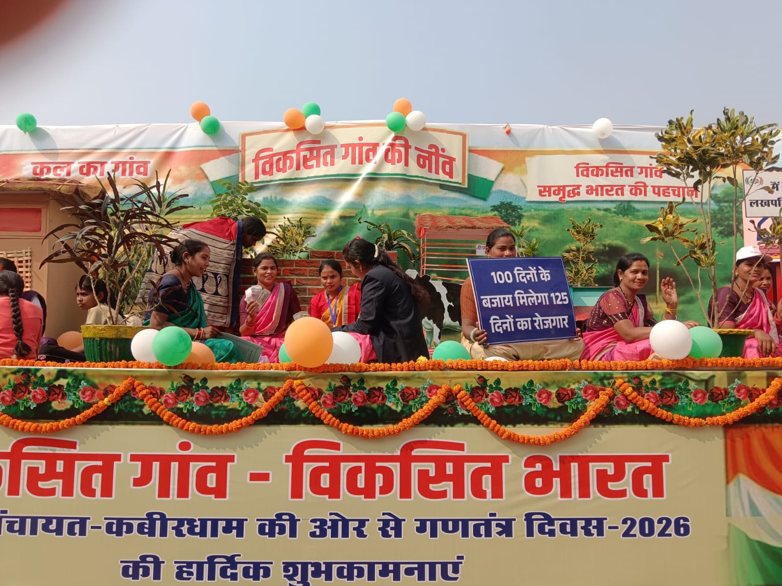 77 वे गणतंत्र दिवस के अवसर पर जिला स्तरीय कार्यक्रम में जिला पंचायत कबीरधाम की झांकी द्वारा छत्तीसगढ़ की परंपराओं के अनुरूप राउत नाचा पार्टी द्वारा रंगारंग प्रस्तुति द्वारा विकसित भारत गारंटी फ़ॉर रोजगार एंड आजीविका मिशन ग्रामीण की प्रमुख विशेषताएं हजारों दर्शकों को एक साथ बताइए गई ।जिनमे जिले के ग्रामीणों को 125 दिनों का रोजगार, समय पर मजदूरी भुगतान,आजीविका एवं जल संरक्षण के कार्यों को प्राथमिकताएं देते हुए कौशल विकास एवं महिला सशक्तिकरण की दिशा में होने वाले परिवर्तनों की पूरी जानकारी राउत नाचा पार्टी द्वारा नाचते ,गाते, बजाते एवं महिला स्व सहायता समूह द्वारा तख्तियों के माध्यम से दी गई है।