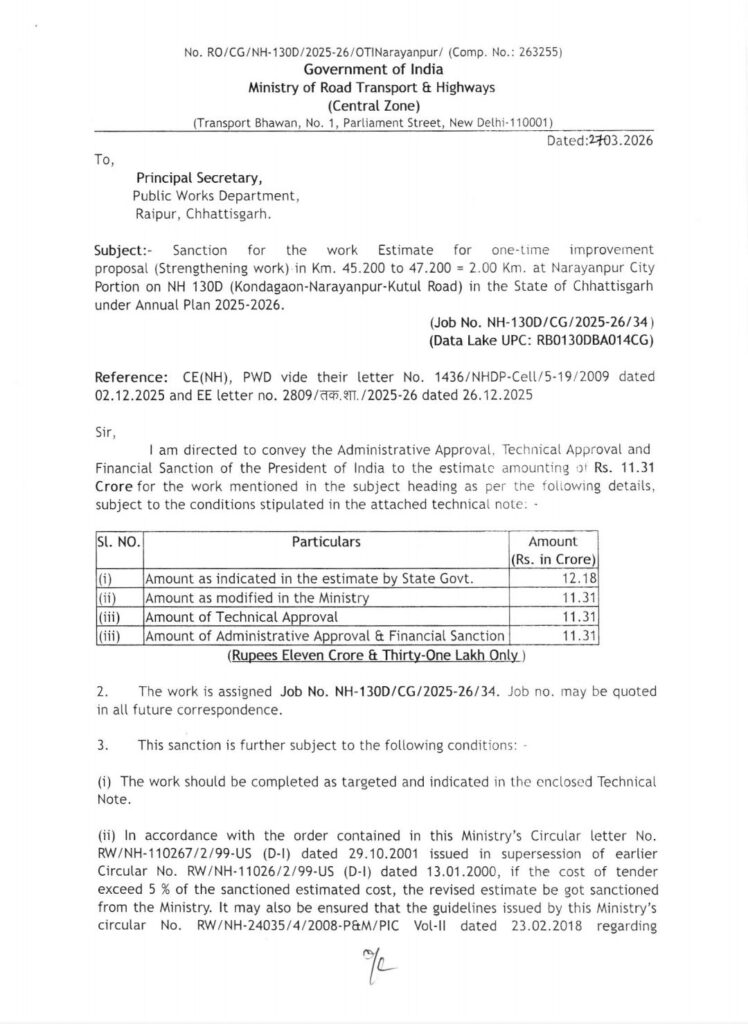 जगदलपुर। बस्तर संभाग के नारायणपुर जिले के समग्र विकास की दिशा में एक और महत्वपूर्ण कदम उठाते हुए एनएच-130 डी अंतर्गत गढ़बेंगाल चौक से मानसरोवर बखरूपारा तक लगभग 2 किलोमीटर सड़क के सुदृढ़ीकरण हेतु 11.31 करोड़ रुपये की स्वीकृति प्रदान की गई है। यह महत्वपूर्ण सौगात क्षेत्र के विधायक एवं केबिनेट मंत्री केदार कश्यप के सतत प्रयासों और सक्रिय पहल का परिणाम है।