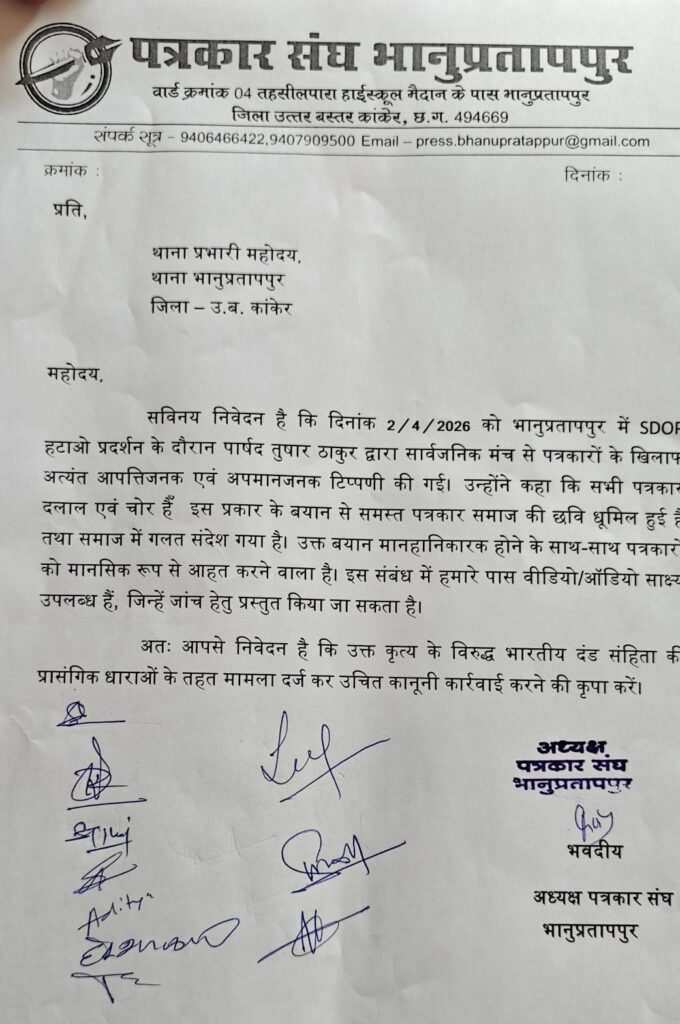 पत्रकार संघ ने अनुविभागीय अधिकारी (राजस्व) को ज्ञापन सौंपकर सख्त कार्रवाई की मांग की है। साथ ही थाना भानुप्रतापपुर में पार्षद और कार्यक्रम आयोजकों के खिलाफ शिकायत दर्ज कराई गई है।