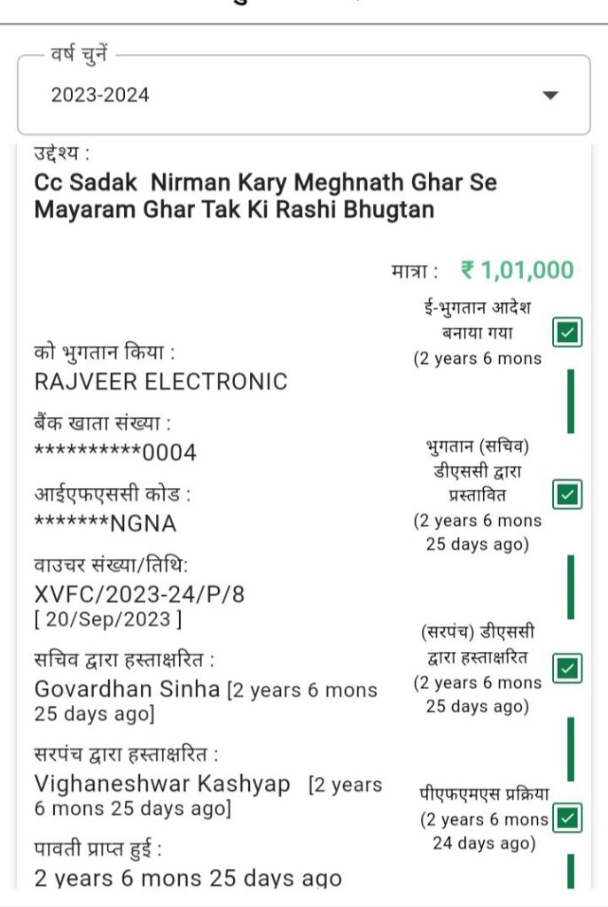 ग्राम पंचायत बड़े देवडा़ में 15वें वित्त आयोग की राशि में गड़बड़ी का एक और मामला सामने आया है। इस बार गदराम घर से जैसिंग घर तक सीसी सड़क निर्माण के नाम पर 1 लाख 60 हजार 400 रुपए का भुगतान फर्म राजवीर इलेक्ट्रॉनिक को करना बताकर राशि आहरित कर ली गई है। पोर्टल पर दर्ज आंकड़ों के अनुसार स्ट्रीट लाईट के नाम पर वाउचर क्रमांक एक्सवीएफसी /2023-24/पी/3, दिनांक 05/09/2023 से एक और भुगतान किया गया है। भुगतान सचिव गोवर्धन सिन्हा और सरपंच विघ्नेश्वर कश्यप द्वारा डिजिटल हस्ताक्षर से पारित किया गया है। कार्य धरातल पर नहीं पाया गया है। फर्म का कार्यक्षेत्र इलेक्ट्रॉनिक्स होने के बावजूद सड़क निर्माण का भुगतान किए जाने से साबित होता है कि यहां दाल में बहुत कुछ काला है। इसी तरह वित्तीय वर्ष 2024- 25 में वाउचर क्रमांक एक्सवीएफसी 2024-25/पी/17 दिनांक 25 अक्टूबर 2024 में यह राशि आहरित की गई है। भुगतान को सचिव जानकी भारती और सरपंच विघ्नेश्वर कश्यप द्वारा डिजिटल हस्ताक्षर से पारित किया गया है। नियम के अनुसार हर भुगतान के लिए कार्य का तकनीकी प्राक्कलन, माप पुस्तिका, जिओ-टैग फोटो, सामग्री का जीएसटी बिल और भौतिक सत्यापन अनिवार्य है। ग्रामीणों का आरोप है कि बड़े देवड़ा पंचायत में मौके पर न तो नई स्ट्रीट लाइट लगी है और न ही बड़ी संख्या में मरम्मत हुई है बडेदेवडा के ग्रामीणों ने कलेक्टर बस्तर से मांग की है कि बकावंड ब्लॉक की सभी पंचायतों में 2023-24 और 2024-25 के 15वें वित्त के कार्यों का थर्ड पार्टी ऑडिट कराया जाए और राजवीर इलेक्ट्रॉनिक फर्म को हुए सभी भुगतानों की जांच एकसाथ की जाए।स्ट्रीट लाइट मरम्मत के नाम पर 44 हजार 100 का भुगतान, फिर राजवीर इलेक्ट्रॉनिक फर्म के नाम पर करना वताया गया है।15वें वित्त आयोग की राशि में अनियमितता के मामले थमने का नाम नहीं ले रहे हैं। अब ग्राम पंचायत बड़ेदेवडा़, एलजीडी कोड 121821 में स्ट्रीट लाइट मरम्मत कार्य के नाम पर 44 हजार 100 रुपए का भुगतान फर्म राजवीर इलेक्ट्रॉनिक को किए जाने का मामला सामने आया है।