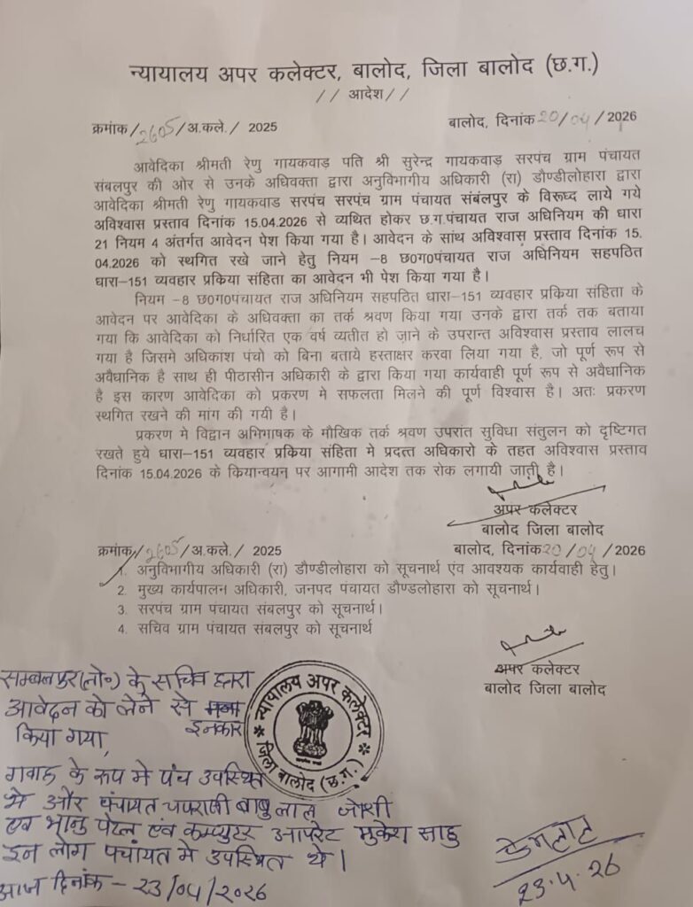 अपर कलेक्टर बालोद ने आदेश क्रमांक 2605/2025, दिनांक 20 अप्रैल 2026 के द्वारा अविश्वास प्रस्ताव के क्रियान्वयन पर आगामी आदेश तक रोक लगा दी है। न्यायालय ने माना कि यह प्रस्ताव लालच देकर लाया गया तथा अधिकांश पंचों के हस्ताक्षर उन्हें बिना बताए करवाए गए थे। पीठासीन अधिकारी की कार्यवाही भी अवैधानिक पाई गई। 23 अप्रैल को जब सरपंच द्वारा न्यायालयीन आदेश का पालन कराने हेतु आवेदन प्रस्तुत किया गया, तो संबलपु के पंचायत सचिव द्वारा आवेदन लेने से स्पष्ट मना कर दिया गया। इस दौरान गवाह के रूप में पंच उपस्थित थे, साथ ही पंचायत के चपरासी बाबूलाल जोशी, भृत्य पटेल एवं कंप्यूटर ऑपरेटर मुकेश साहू भी पंचायत में उपस्थित थे। सरपंच रेणु गायकवाड़ ने कहा है कि मुझे न्यायपालिका पर पूरा भरोसा है। सत्य की जीत हुई है। अपर कलेक्टर के आदेश के बाद भी सचिव द्वारा आवेदन न लेना न्यायालय की अवमानना है। सरपंच श्रीमती गायकवाड़ ने शासन-प्रशासन से मांग की है कि सचिव के विरुद्ध तत्काल अनुशासनात्मक कार्रवाई की जाए। सरपंच ने ग्राम संबलपुर की जनता को विश्वास दिलाया है कि विकास कार्य बिना किसी बाधा के चलते रहेंगे।
