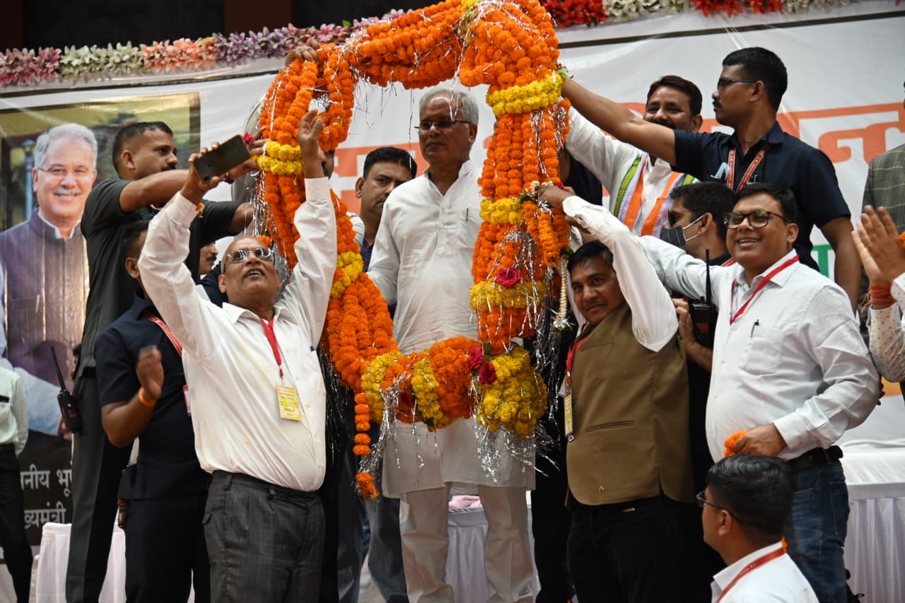 रायपुर :- राजधानी के इंडोर स्टेडियम में मुख्यमंत्री भुपेश बघेल छत्तीसगढ़ शिक्षा संवर्ग एवं पंचायत सचिव संघ के संयुक्त तत्वाधान आयोजित सम्मान समारोह में शामिल हुए । मुख्यमंत्री भुपेश बघेल के पहुंचते ही कका है तो भरोसा है …पेंशन पुरुष और न्याय पुरुष जिंदाबाद के नारों से गूंज उठा इंडोर स्टेडियम ।