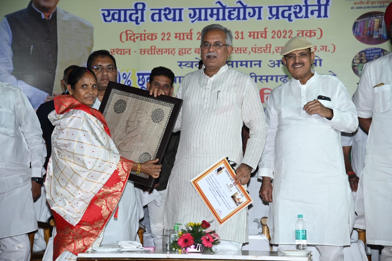 रायपुर :- मुख्यमंत्री भूपेश बघेल ने कहा है कि खादी कपड़ा नहीं बल्कि एक विचार है। राष्ट्रपिता महात्मा गांधी ने खादी को आजादी की लड़ाई का एक अस्त्र के रूप में इस्तेमाल किया था। महात्मा गांधी ग्राम स्वराज की कल्पना करते हुए वे चाहते थे कि हमारे गांव हर तरह से ताकतवर बनें। हम भी महात्मा गांधी की राह पर चलते हुए कारीगरों, बुनकरों, शिल्पियों का कौशल निखार रहे हैं। हर गांव एक उत्पादक और शहर विक्रय केन्द्र बनें। उन्होंने कहा कि हमारा प्रयास है कि गांव स्वावलंबी और प्रदेश के लोग आत्मनिर्भर बनें। मुख्यमंत्री ने इस आशय के विचार आज देर शाम पण्डरी छत्तीसगढ़ हाट बाजार में आयोजित 10 दिवसीय राज्य स्तरीय खादी तथा ग्रामोद्योग प्रदर्शनी में व्यक्त किए। मुख्यमंत्री ने इस अवसर पर विभिन्न क्षेत्रों में उत्कृष्ट कार्य करने वाले बुनकरों और शिल्पकारों को सम्मानित किया।