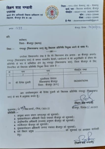 बीजापुर :- जिले के गंगालूर (विकास खण्ड स्तर) क्षेत्र के लिए बस्तर विकास प्राधिकरण उपाध्यक्ष व विधायक विक्रम मण्डावी ने दिनेश पुजारी को अपना प्रतिनिधि नियुक्त किया है ।