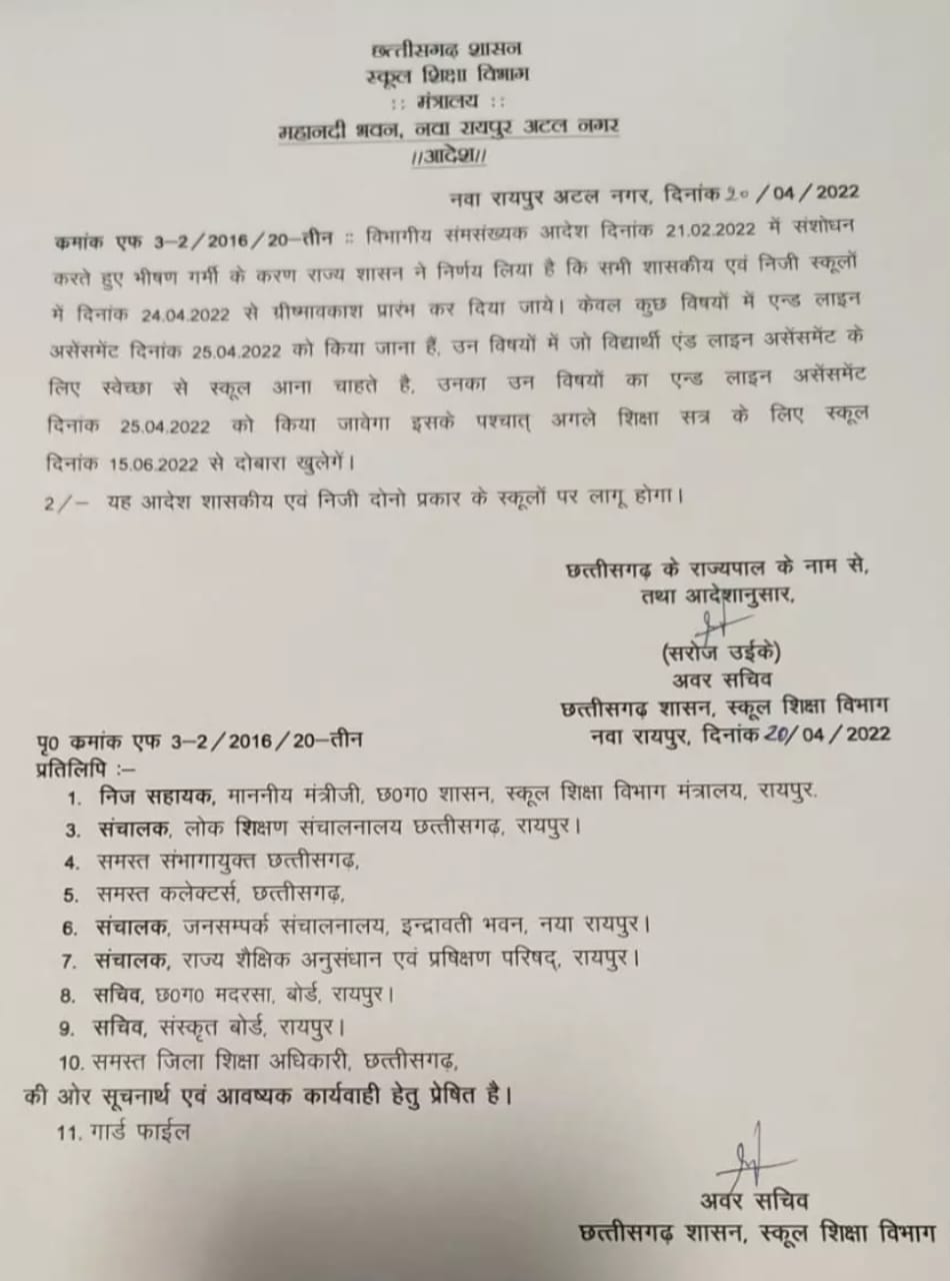 रायपुर :- स्कूल शिक्षा विभाग ने भीषण गर्मी को देखते हुए राज्य के सभी शासकीय एवं निजी स्कूलों में 24 अप्रैल से 14 जून तक ग्रीष्मावकाश देने का निर्णय लिया है।