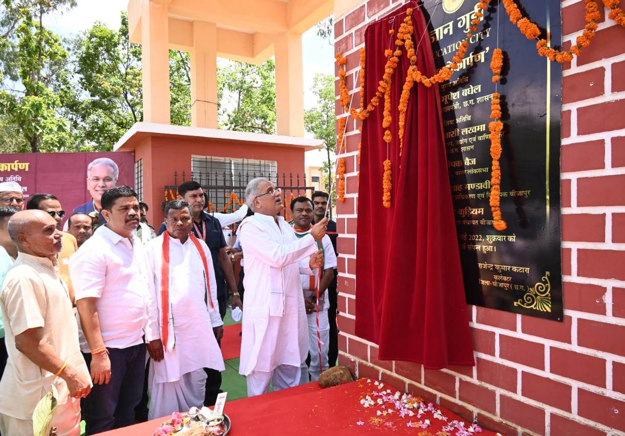 बीजापुर :- मुख्यमंत्री भूपेश बघेल ने आज भेंट-मुलाकात अभियान के दौरान बीजापुर में ज्ञान गुड़ी एजुकेशन सिटी का लोकार्पण कर जिलेवासियों को शिक्षा के क्षेत्र में एक महत्वपूर्ण सौगात दी। इस अवसर पर उन्होंने ज्ञानगुड़ी परिसर में रुद्राक्ष के पौधे का रोपण किया। मुख्यमंत्री ज्ञानगुड़ी में जिला पुनर्वास केंद्र समर्थ पहुंचकर दिव्यांग बच्चों से मिले और उन्होंने परिसर का भ्रमण कर व्यवस्थाओं की जानकारी ली। मुख्यमंत्री के स्वागत में बच्चों ने मनमोहक नृत्य की प्रस्तुति दी। समर्थ के सभी बच्चों ने बम बम बोले, छोटी सी आशा गाने पर नृत्य की प्रस्तुति दी, जिस पर मुख्यमंत्री भावविभोर हो गए। समर्थ के बच्चों ने अपने हाथों के पंजांे की छाप से सजे पुनर्वास केंद्र समर्थ की तस्वीर मुख्यमंत्री को भेंट की।