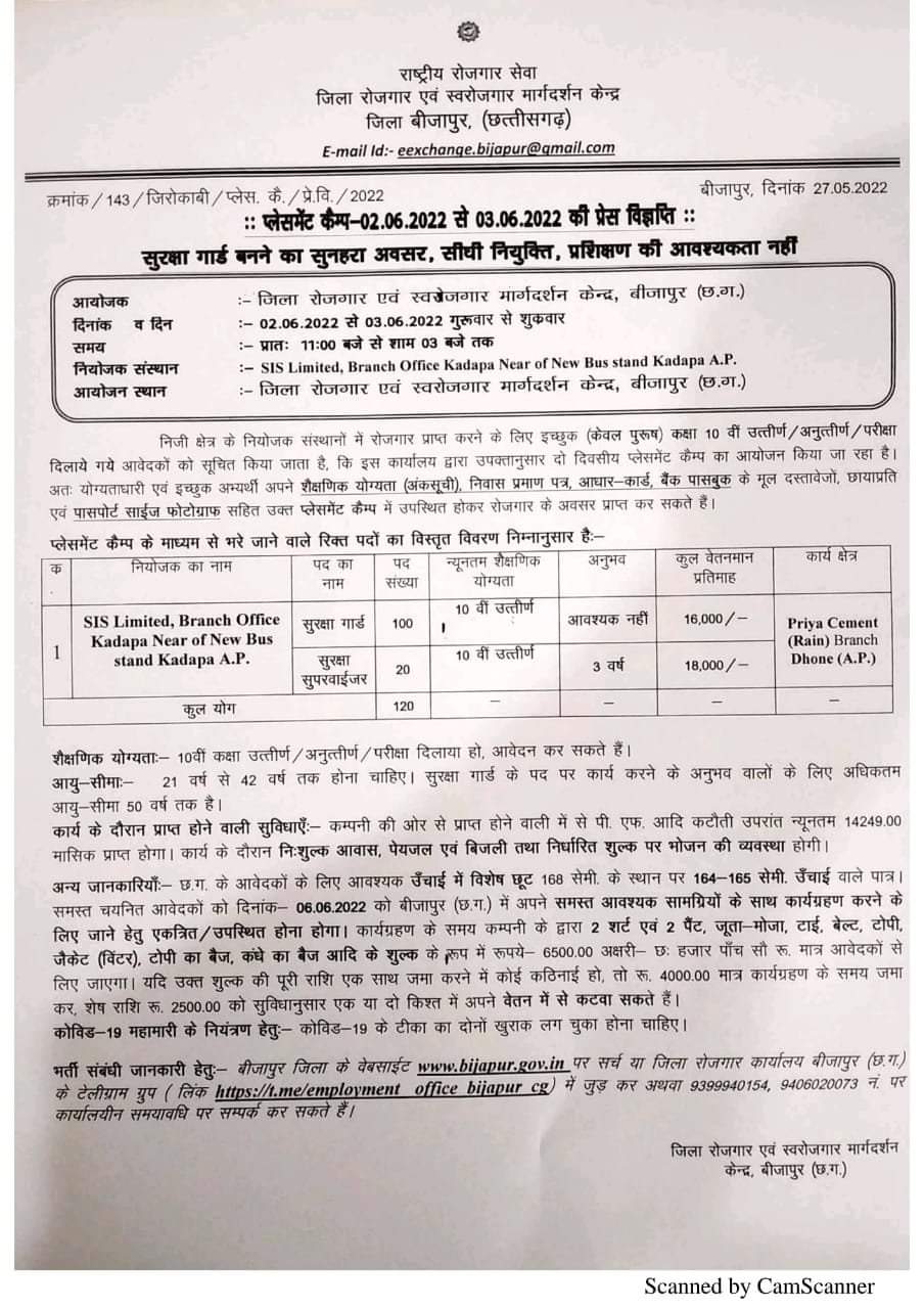 बीजापुर :- जिला रोजगार एवं स्वरोजगार मार्गदर्शन केन्द्र बीजापुर में 2 एवं 3 जून को 11 बजे से 3 बजे तक प्लेसमेंट कैंप का आयोजन किया जायेगा। निजी क्षेत्र के नियोजक संस्थानों में रोजगार प्राप्त करने के लिए जिले के दसवी कक्षा उर्तीण, अनुर्तीण परीक्षा में बैठे आवेदको को दो दिवसीय प्लेसमेंट कैंप के माध्यम से सुरक्षा गार्ड एवं सुपरवाईजर के पदों पर भर्ती हेतु निर्धारित समय में आवश्यक दस्तावेजों के साथ जिला रोजगार कार्यालय बीजापुर में संपर्क कर सकते है। यह भर्ती केवल पुरुष उम्मीदवार के लिए आयोजित की जा रही है। भर्ती से संबंधित सम्पूर्ण विवरण जिले के वेबसाईट डब्ल्यू डब्ल्यू डब्ल्यू डॉट बीजापुर डॉट जीओव्ही डॉट इन अथवा जिला रोजगार कार्यालय बीजापुर के टेलीग्राम ग्रुप लिंक https://t.me/employment office bijapur cg में जुड़कर अथवा मोबाईल नंबर 9399940154, 9406020073 पर कार्यालयीन समयावधि पर सम्पर्क कर सकते है।