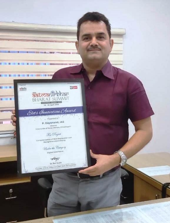 रायपुर :- आत्मनिर्भर भारत समिट में छत्तीसगढ़ को डिजिटल गवर्नेंस के लिए एलेट्स इनोवेशन अवार्ड से सम्मानित किया गया है। नई दिल्ली में आयोजित समारोह में समाज कल्याण विभाग को यह अवार्ड ’एनजीओ पंजीकरण को कम्प्यूटरीकृत करने और मान्यता और अनुदान‘ की प्रक्रिया ऑनलाइन करने के लिए दिया गया है। इलेट्स टेक्नो इंडिया के सीईओ डॉ. रवि गुप्ता ने यह अवार्ड छत्तीसगढ़ राज्य के समाज कल्याण विभाग के संचालक पी. दयानंद का प्रदान करते हुए बधाई दी हैं। मुख्यमंत्री भूपेश बघेल और समाज कल्याण मंत्री श्रीमती अनिला भेंड़िया ने प्रदेशवासियों और समाज कल्याण विभाग को इस विशेष उपलब्धि पर बधाई और शुभकामनाएं दी हैं।