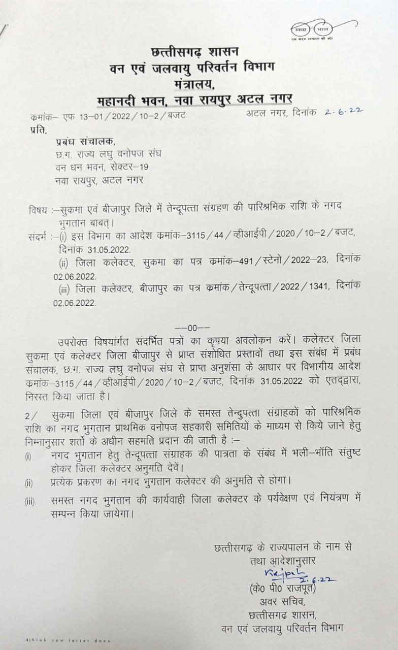 जारी आदेश में कहा गया है की कलेक्टर जिला सुकमा एवं कलेक्टर जिला बीजापुर से प्राप्त संशोधित प्रस्ताव तथा इस संबंध में प्रबंध संचालक राज्य लघु वनोपज संघ से प्राप्त अनुशंसा के आधार पर पूर्व आदेश को निरस्त करते हुए सुकमा एवं बीजापुर जिले के समस्त तेंदूपत्ता संग्राहकों का पारिश्रमिक राशि का नगद भुगतान प्राथमिक वनोपज सहकारी समितियों के माध्यम से किए जाने के लिए सहमति प्रदान की गई है जिसमें नगद भुगतान के लिए तेंदूपत्ता संग्राहक की पात्रता के संबंध में भली-भांति संतुष्ट होकर जिला कलेक्टर अनुमति देंगे साथ ही प्रत्येक प्रकरण का नगद भुगतान कलेक्टर की अनुमति से होगा और यह नगद भुगतान की कार्यवाही जिला कलेक्टर के पर्यवेक्षण व नियंत्रण में संपन्न होगा।