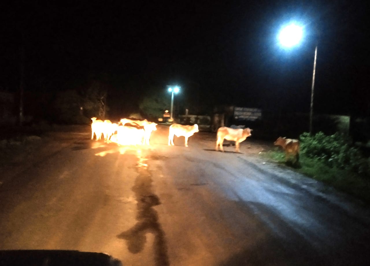 रात में मॉडल गोठान डोण्डे वाली स़ड़क हरनगढ़ चौक पर रहता हैं मवेशियों का जमावड़ा, रेका छेका योजना फेल