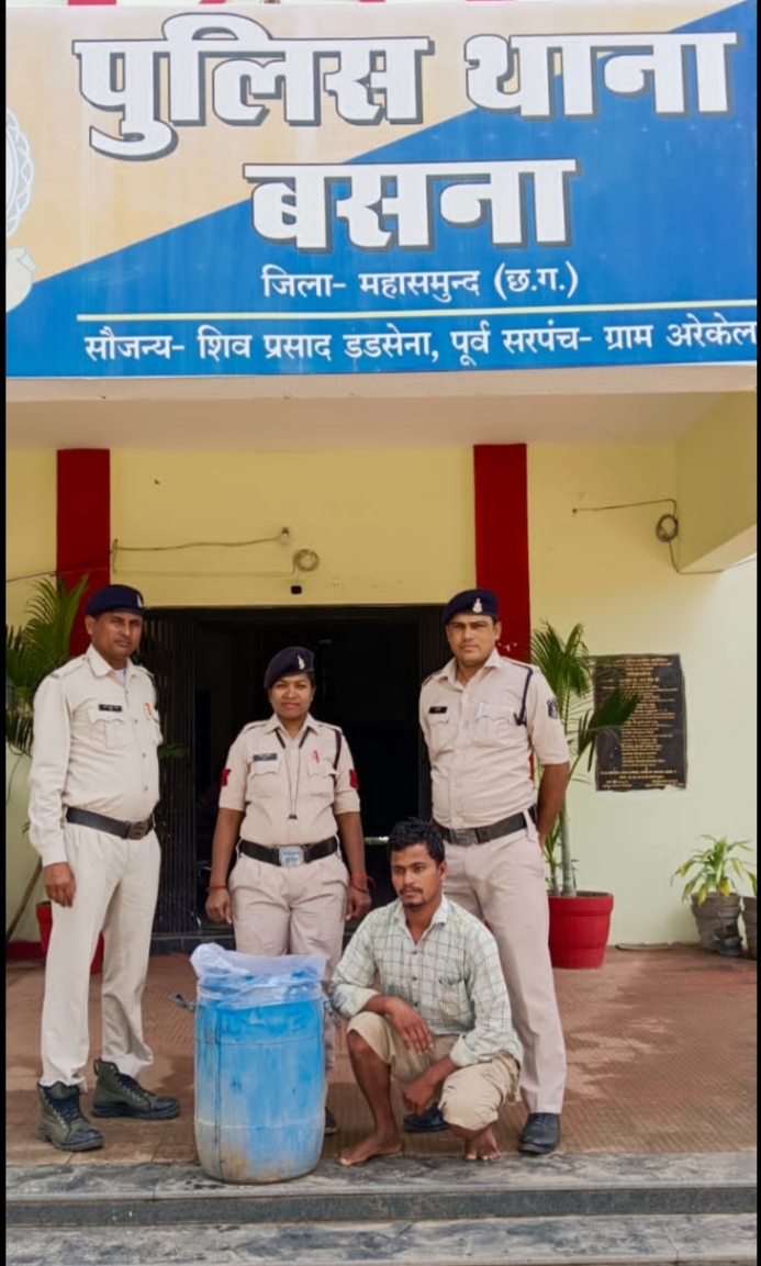 शराब कोचियों पर बसना पुलिस की कार्यवाही, ग्राम बानीपाली में आरोपी दुर्योधन मुकर्जी से 50 लीटर अवैध महुआ शराब जप्त