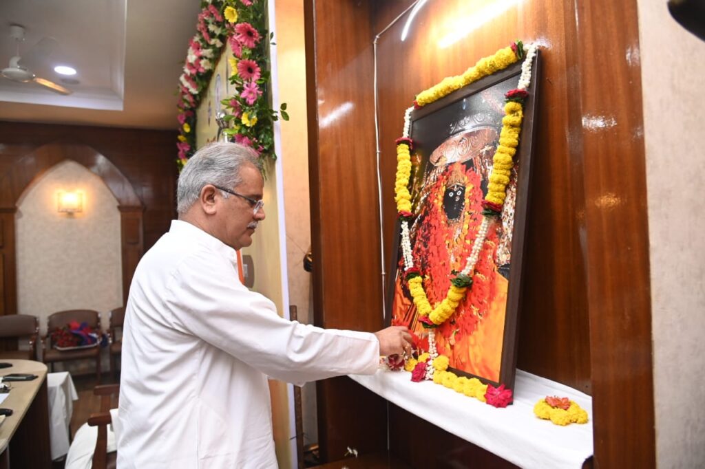 रायपुर :- मुख्यमंत्री भूपेश बघेल ने विश्व आदिवासी दिवस पर मुख्यमंत्री निवास कार्यालय में मां दंतेश्वरी की पूजा अर्चना कर आयोजित कार्यक्रम का शुभारम्भ किया ।