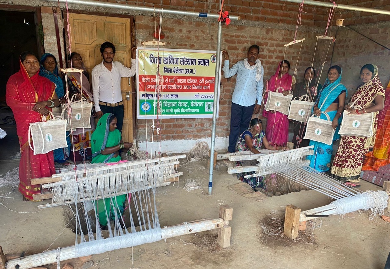 रायपुर :- इंदिरा गांधी कृषि विश्वविद्यालय द्वारा रायपुर में 16 एवं 17 अगस्त को आयोजित देशभर के कृषि वैज्ञानिकों की कार्यशाला में केला तना रेशा से बना कान्फ्रेंस बेग भेंट स्वरूप दिया जाएगा। केला तना रेशा से यह कान्फ्रेंस बेग बेमेतरा जिले के साजा विकासखण्ड के आदर्श गौठान राखी से जुड़ी उन्नति केला तना रेशा उत्पादक महिला समूह ने तैयार किया है। इंदिरा गांधी कृषि विश्वविद्यालय रायपुर के ऑर्डर पर महिला समूह ने 250 नग कान्फ्रेंस बेग की आपूर्ति की है।