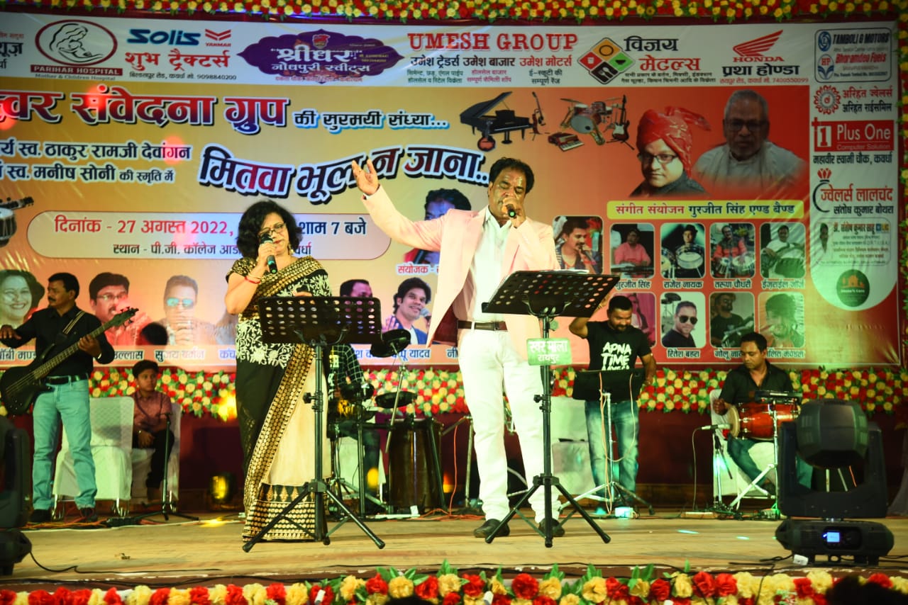 कवर्धा:- संगीत, कला, साहित्य को समर्पित स्वर संवेदना ग्रुप ने अपने आठवें आयोजन ” मितवा भूल न जाना” सुरमयी संगीतमय कार्यक्रम का आयोजन किया जिसमें कवर्धा नगर के संगीत गुरु आचार्य स्व. ठाकुर राम जी देवांगन एवम गिटार वादक स्व. मनीष सोनी के स्मृति में संगीतमय आयोजन किया जिसमें देश प्रदेश के गायक एवम वादक कलाकारों द्वारा सुरमयी प्रस्तुति दी गई । उक्त कार्यक्रम में जनप्रतिनिधि , प्रशासनिक अधिकारी, वरिष्ठ नागरिकगण पत्रकारगण एवम संगीतप्रेमियों ने भरपूर लुफ्त उठाया , कवर्धा के संगीतप्रेमियों ने संगीत गुरुओं को सुरमयी श्रद्धांजलि अर्पित किया ।