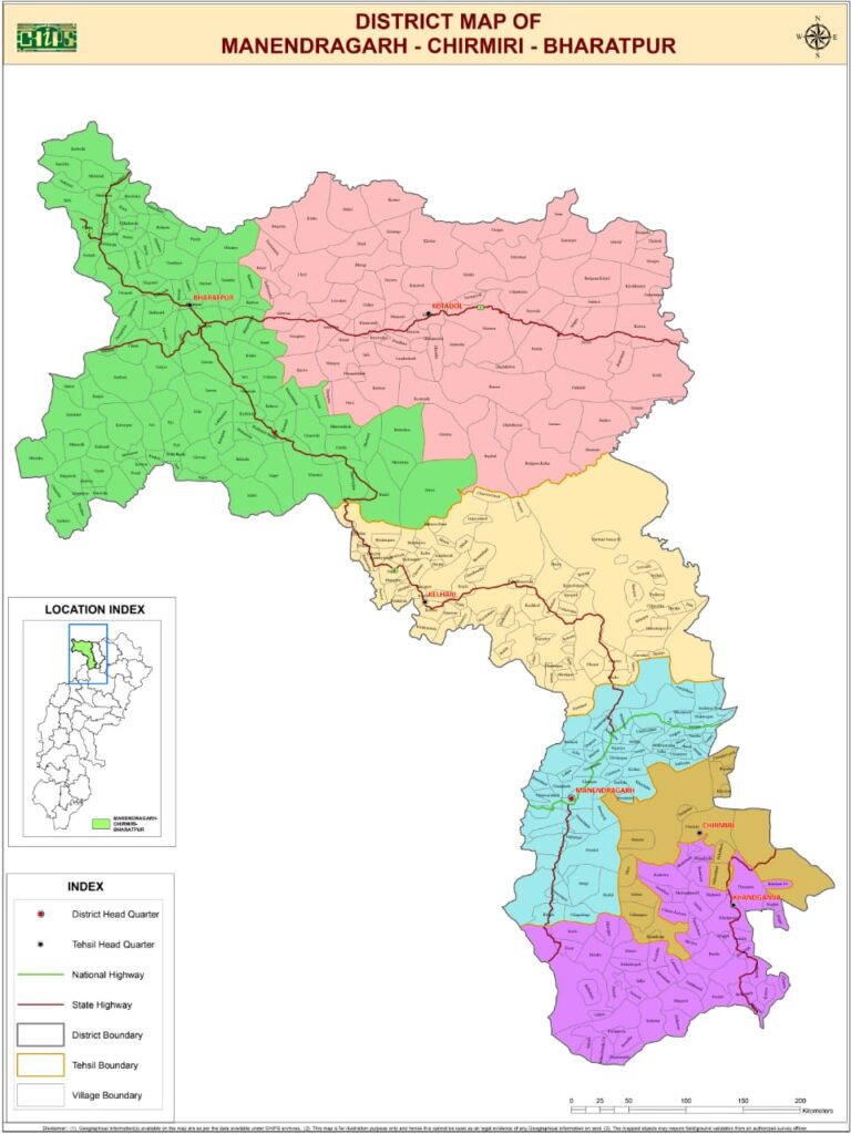 प्रस्तावित गठित नवीन मनेन्द्रगढ़-चिरमिरी-भरतपुर जिले में कुल ग्रामों की संख्या 376 है। यहां 13 राजस्व निरीक्षक मण्डल तथा 87 पटवारी हल्का है। प्रस्तावित नवीन जिले का भौगोलिक क्षेत्रफल 1 लाख 46 हजार 824 हेक्टयर है। यहां की जनसंख्या 3 लाख 76 हजार 696 है। प्रस्तावित गठित नवीन जिला मनेन्द्रगढ़-चिरमिरी-भरतपुर में तहसील मनेन्द्रगढ़ में ग्रामों की संख्या 59, केल्हारी में ग्रामों की संख्या 74, भरतपुर में ग्रामों की संख्या 108, खड़गवां में ग्रामों की संख्या 44 एवं चिरमिरी में ग्रामों की संख्या 16 और तहसील कोटाडोल में ग्रामों की संख्या 75 है। नवगठित जिले में अमृतधारा जलप्रपात, सिद्धबाबा मंदिर (मनेन्द्रगढ़)सीतामढ़ी-हरचौका (रामवनगमन पर्यटन परिपथ) भरतपुर, रमदहा जलप्रपात जैसे पर्यटन स्थल भी शामिल हैं।