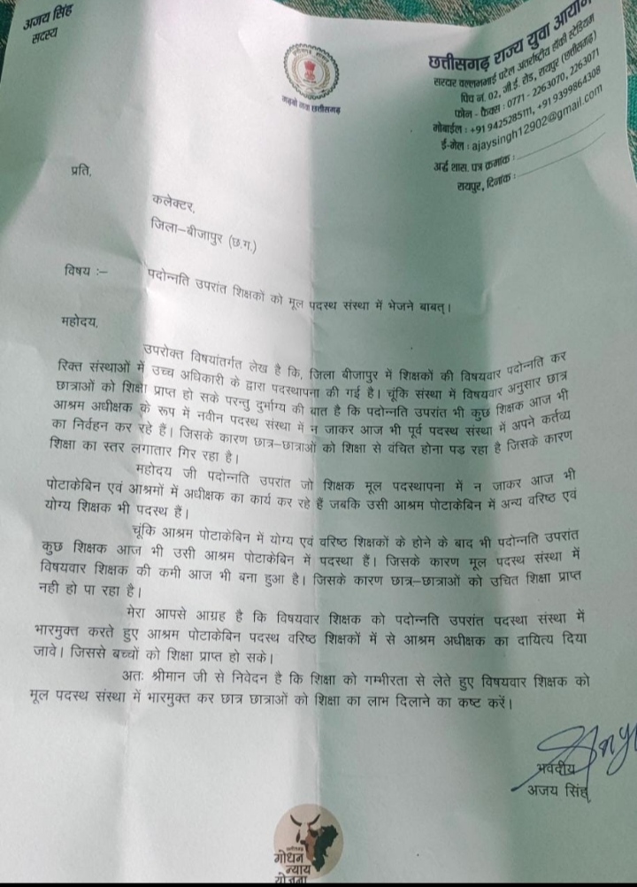 अजय का कहना है कि जिले में कुछ शिक्षक पदोन्नति का लाभ लेने के बाद भी आश्रम अधीक्षक जैसे पदों पर काबिज है, जबकि विभाग की तरफ से उन्हें विषयवार शिक्षको की कमी से जूझ रहे संस्थाओं में नवीन पदस्थापना के रूप में ज्वाइनिंग के आदेश दिए गए है, परन्तु उक्त शिक्षको द्वारा ज्वाइनिंग देकर भी पूर्व संस्थाओं में पदों पर बने हुए है।