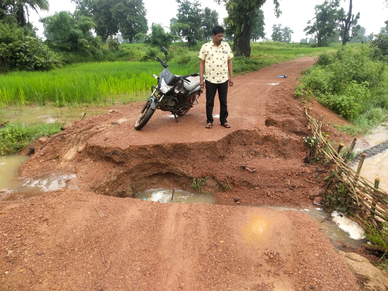 सड़क बही,बारिश में पाइप पुलिया धंसा,कैसे होगा आवागमन– बड़े कापसी माठ पारा के ग्रामीण परेशान