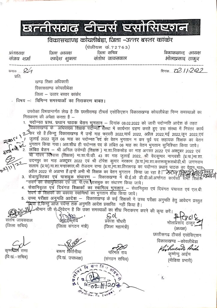 एसोसिएशन के जिला कांकेर सचिव संतोष जायसवाल, जिला संगठन मंत्री राम मनोरथ राय, जिला संगठन सचिव प्रकाश चौधरी, कोयलीबेड़ा ब्लॉक अध्यक्ष भोला प्रसाद ठाकुर ने बताया कि विकासखंड के शिक्षकों के द्वारा अवगत कराए गए समस्याओं पर संज्ञान लेते हुए निम्न बिंदुओं को अनुसार बीईओ कोयलीबेड़ा से विस्तृत चर्चा की गई तथा समस्याओं के अभिलंब निराकरण की मांग की गई। मांग पत्र में मुख्य बिंदु निम्नानुसार है-