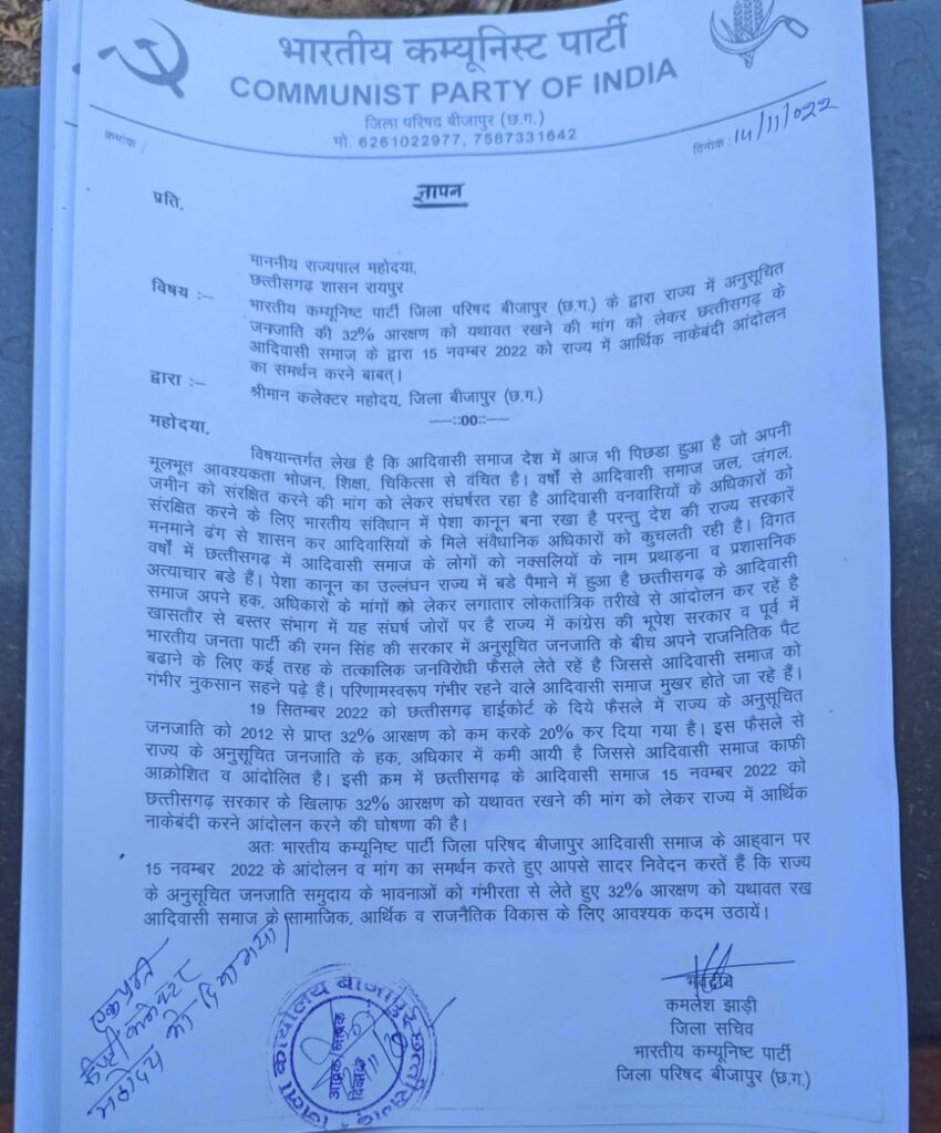 इसी क्रम में छत्तीसगढ़ की आदिवासी समाज 15 नवंबर 2022 को छत्तीसगढ़ सरकार के खिलाफ व 32% आरक्षण को यथावत रखने की मांग को लेकर राज्य में आर्थिक नाकेबंदी करने आंदोलन करने की घोषणा की है। जिसका समर्थन भारतीय कम्युनिस्ट पार्टी जिला कमेटी बीजापुर करती है।
