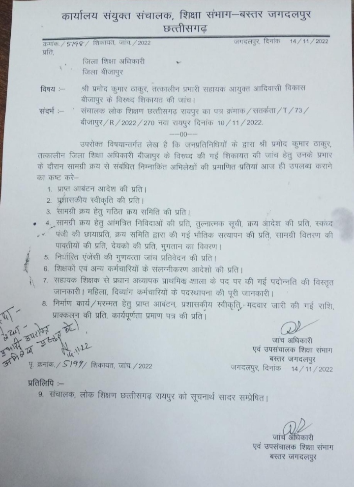 बीजापुर शिक्षाधिकारी के द्वारा जिले में हुई अनियमितता की शिकायत जिला पंचायत अध्यक्ष, उपाध्यक्ष व अनेक सदस्यों ने मुख्यमंत्री से की थी. शिकायत में आरोप लगाया है कि तत्कालीन सहायक आयुक्त आदिवासी विकास श्रीकांत दुबे पर कथित तौर पर शिक्षको ने लिखित शिकायत की जिसको संज्ञान में लेकर प्रशासन ने उन्हें हटा दिया था, और उनके स्थान पर जिला शिक्षाधिकारी प्रमोद ठाकुर को आदिवासी विकास सहायक आयुक्त का प्रभार दिया गया. उस अवधि में प्राथमिक शालाओं के सहायक शिक्षको की प्रधान- पाठक, शिक्षको का संलग्नीकरण, दिव्यांग एवं महिला शिक्षको की पद स्थापना में जमकर ” खेला” किया गया था । उक्त अधिकारी द्वारा मोटी रकम लेकर शिक्षको को पदोन्नति, संलग्नीकरण, एवं पद स्थापना दी गई । इसके अतिरिक्त विभाग से संबंधित भवनों की मरम्मत व निर्माण के नाम पर शासकीय राशि , विभाग के लिए सामग्री, शालाओ में प्रयोग शाला के उपकरणों तथा अन्य सामग्री में आर्थिक अनियमितता बरती गई । मुख्यमंत्री ने इस मामले को गंभीरता से संज्ञान में लेकर विभागीय सचिव को जांच का निर्देश दिया. इसके बाद संचालक लोक शिक्षण ने विभाग के उप संचालक मधु वर्मा के नेतृत्व में जांच कमेटी का गठन किया ।