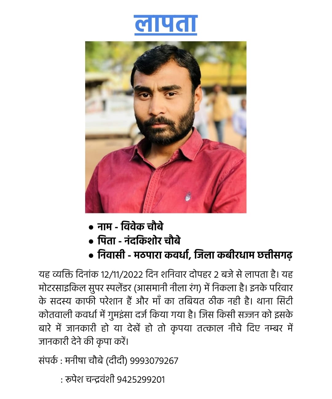 कवर्धा :- कवर्धा मे पत्रकार विवेक चौबे लगभग दस दिनों से लापता हैं, इस संबंध में विवेक चौबे कि बहन ने सिटी कोतवाली में रिपोर्ट दर्ज कराई कि मेरे भाई विवेक चौबे जो कि 10 दिनों से घर नही आया अनहोनी की आशंका को देखते हुये बहन ने पत्रकार साथियों से सहयोग की मांग की।पत्रकारों ने पुलिस अधीक्षक डॉ लाल उमेंद सिंह से संपर्क कर पता लगाने हेतु अनुरोध किया गया।पुलिस अधीक्षक डॉ लाल उमेंद सिंह के द्वारा इस संबंध में तत्काल उचित कार्यवाही करने का आश्वासन दिया गया।
